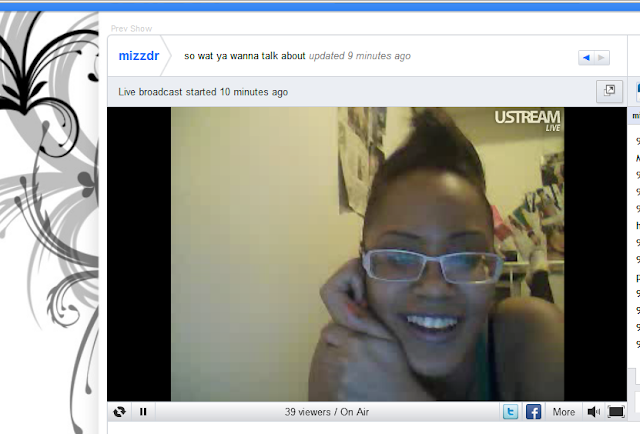 I didn't take too many...It was a cool chat. She answered questions and interacted with the room. Held it down. Hopefully, her promise of doing it more often will come to fruition. (She is very busy with school, the pics and appearances so that wasn't a diss. It will be hard to get on Ustream for her on the regular I imagine...)